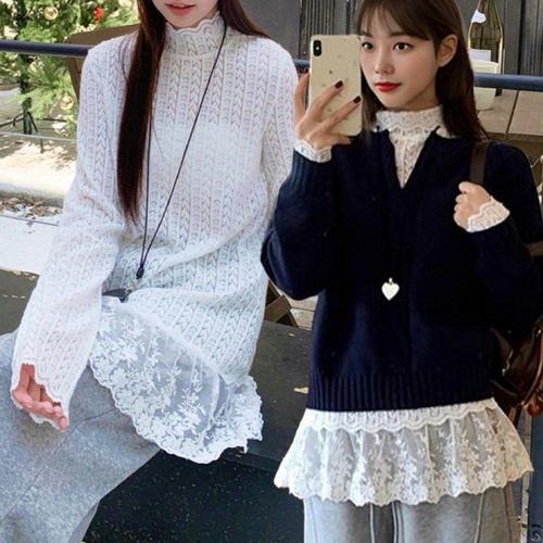 POMTOR 1+1 여성 레이스 셔츠 반폴라 이너 긴팔 티셔츠