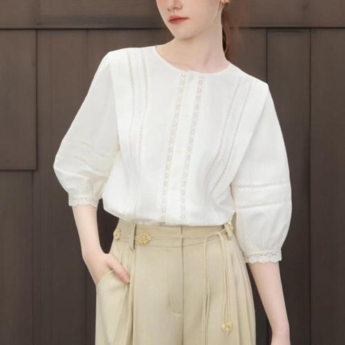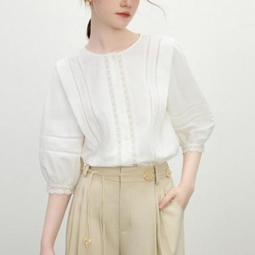 [신상오픈런]여성 아이보리 레이스 펀칭 7부 라운드넥 블라우스