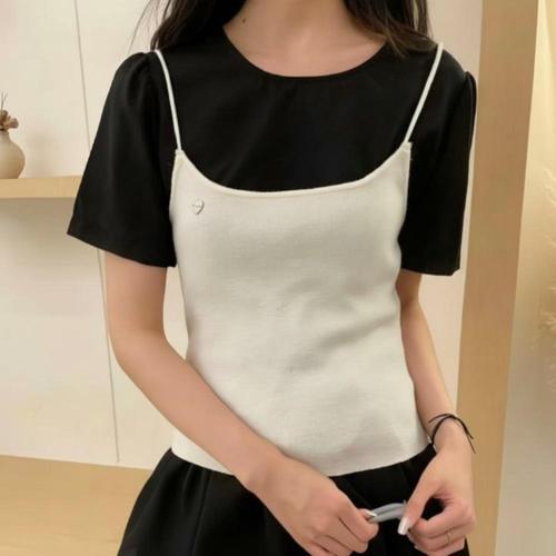 1+1 여성용 여름 배색 끈 나시 민소매 티셔츠 베이직 슬리브리스 이너탑 레이어드용