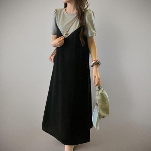[신상오픈런]여성 캐주얼 레이어드 반팔 티셔츠 뷔스티에 긴 원피스