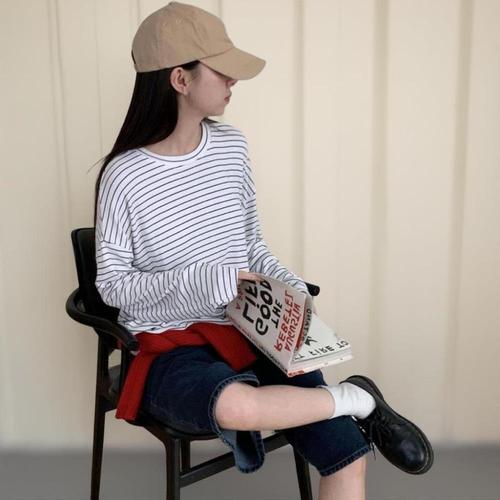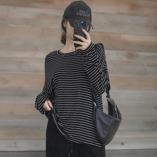 [신상오픈런]여자 루즈핏 라운드넥 단가라 레이온 스판 긴팔티