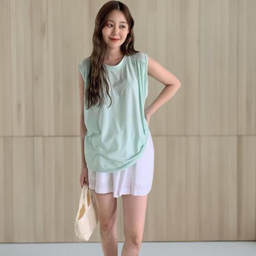 [신상오픈런]여자 레이온 스판 라운드넥 핀턱 셔링 민소매 티셔츠