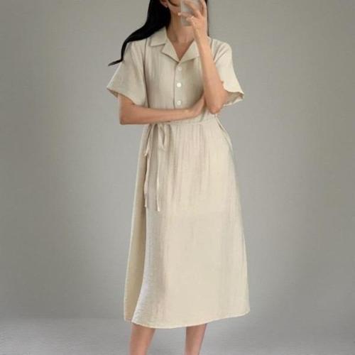 [신상오픈런]|KDO55D0|여성용 레이온 허리 조절 카라넥 버튼 반팔 긴 원피스_21887496_597559
