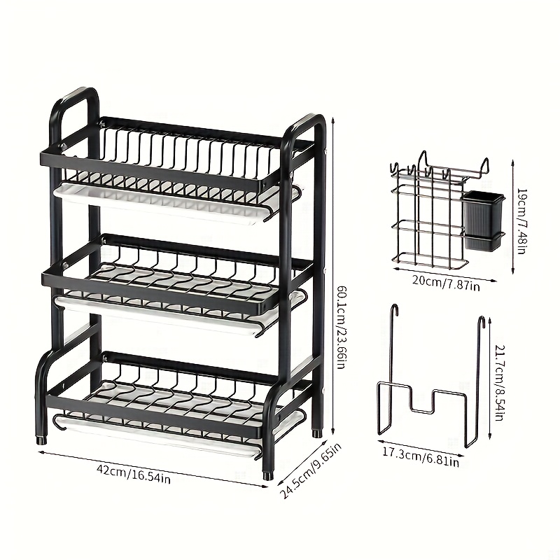 TEMU 3단 헤비듀티 스테인리스 스틸 주방 수납 선반 - 배수 시스템 및 하단 선반 포함 - 대용량 공간 절약형 수직 정리대 (식기, 접시, 냄비, 팬, 그릇용) - 작은 주방, 식기 건조 및 팬용 튼튼한 금속 선반