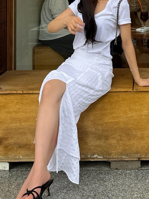 [에브모우] 더블 레이어 슬릿 롱스커트 -화이트