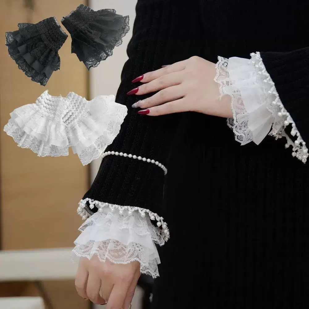 여성용 레이스 반팔 소매 커프스, 우아한 로리타 소매, 프릴 자수 손목 커프스, 화이트 블랙, 1 쌍 패션