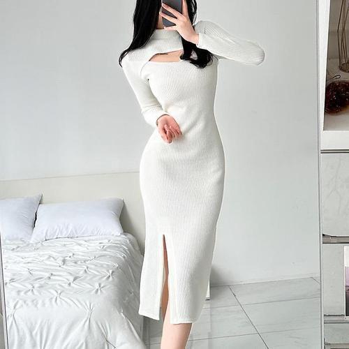 [다잇템]여자 크림색 FW 검정 가슴트임 하이넥 롱원피스 (12429211A)