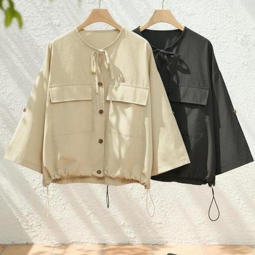 [옷자락] 여자 노카라 타이넥 포켓 롤업 폴리 블라우스
