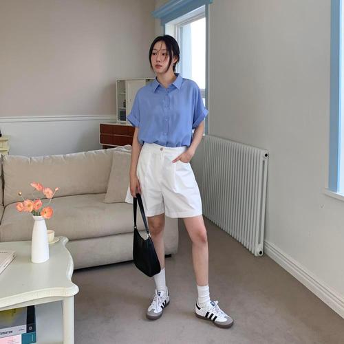 [셀럽하우스]여자 QJWS7676 오픈 롤업 트렌드 반팔 셔츠 데일리 무지 출퇴근