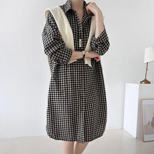 [셀럽하우스]봄 ASQG9440 체크패턴 롱남방 원피스 허리끈 소매 셔츠