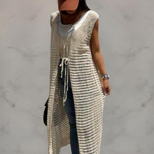[옷자락]여자 민소매 브이넥 리본 니트 펀칭 롱가디건