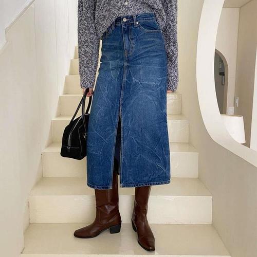 여성 데님 롱 원피스 청 치마 스커트 민소매 나시 플레어 슬림 NQ56