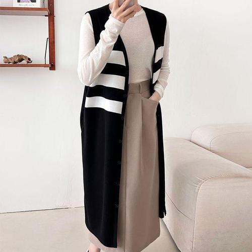 [옷자락]여성 롱베스트 배색 브이넥 버튼 등원룩 일자 조끼