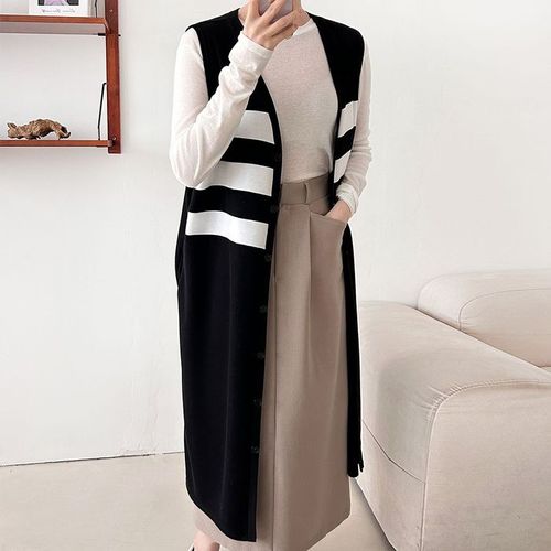 [옷자락] 여성 롱베스트 배색 브이넥 버튼 등원룩 일자 조끼