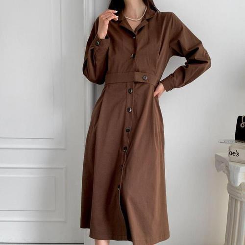 [다잇템]여자 가을하객룩 핀턱 에이라인 단추 롱원피스 (18040523A)