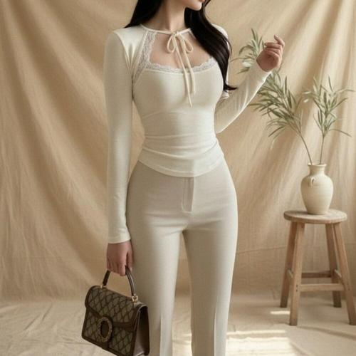[다잇템]여성 롱슬리브 컷아웃 레이스 리본 슬림핏 티