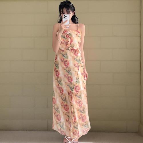 [하프클럽/]여성 귀여운 스트랩 플라워패턴 롱 시폰 원피스