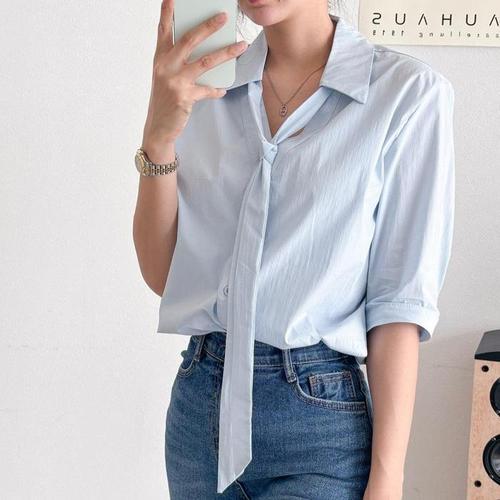 [다잇템]여자 롱타이 흰남방 오피스코어룩 하늘색 셔츠 (15613481A)