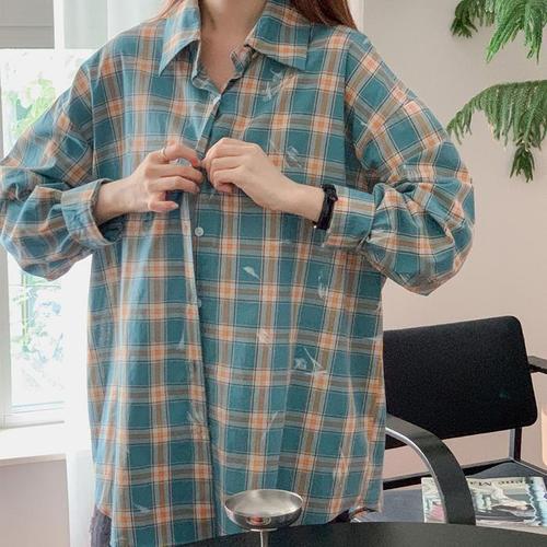 [다잇템]여성 격자 빅사이즈 롱슬리브 캐쥬얼 셔츠