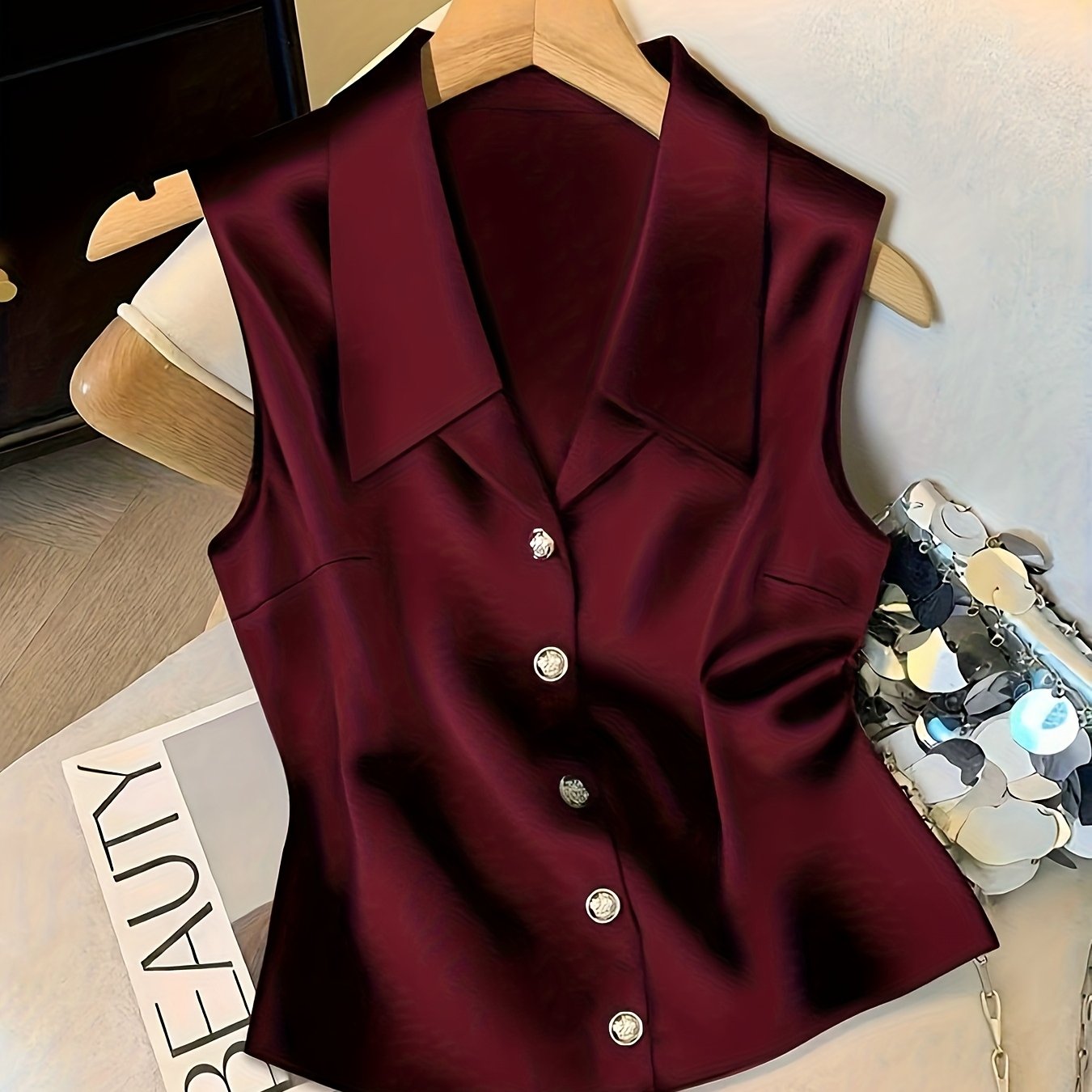 TEMU 사계절용 베스트, 라운드넥 진주 루즈핏 새틴 조끼, 캐주얼하고 우아함, 외출, 통근, 집, 파티에 적합, 여성 의류