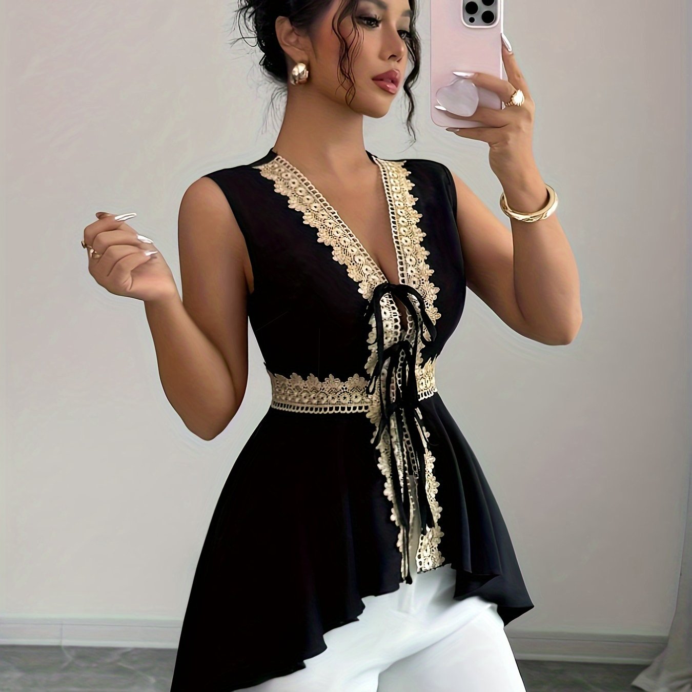 TEMU 크로스보더 신상 캐주얼 레이스 트림 스플라이스 테일 레이스업 여성용 패션 조끼