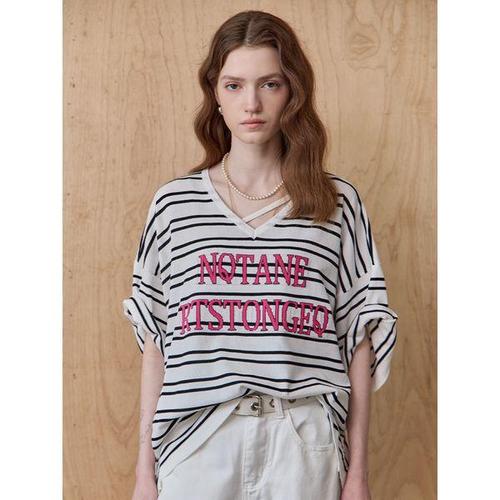 [마쟈]배색 레터링 스트라이프 브이넥 루즈핏 니트