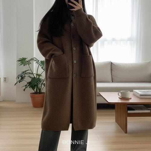 [보니제이]루즈핏 하이넥 롱가디건 부드러운 버튼 코트형 데일리
