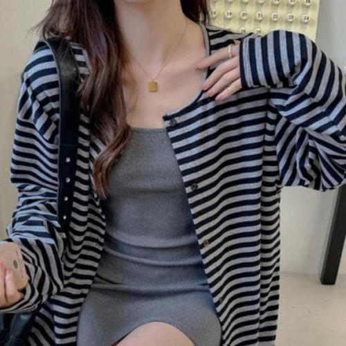 [에이치플러스몰]여성 데일리 루즈핏 롱 긴팔 스트라이프 버튼 가디건