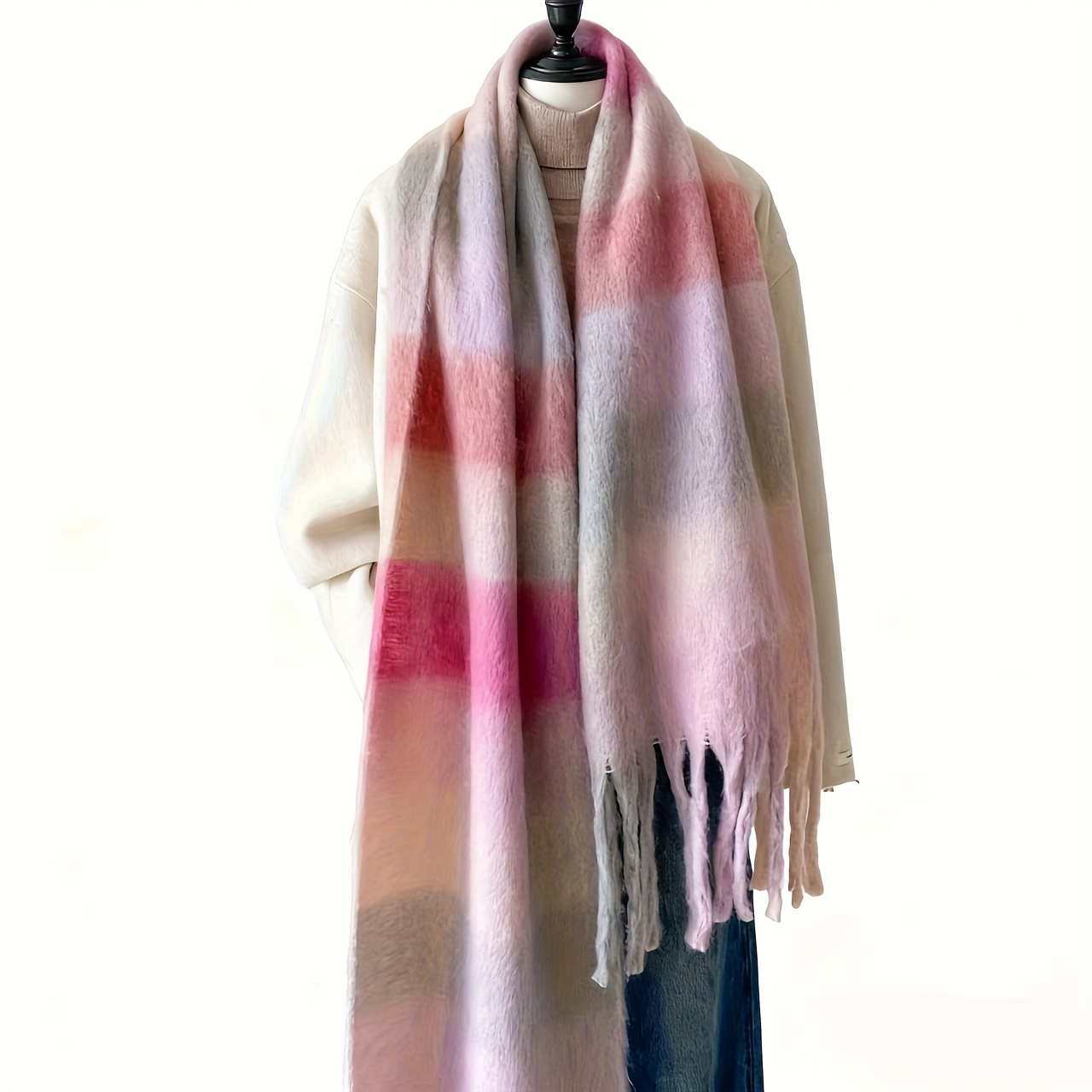 TEMU 여성용 두꺼운 따뜻한 블루 & 체크 스카프 - 양면 겨울 스카프, 태슬 트림, 따뜻한 부드러운 원단, 추운 날씨, 캐주얼 & 포멀 의상 - 세탁기 사용 가능, 우아한 액세서리, 스타일리시 랩, 패션 애호가, 다용도 랩