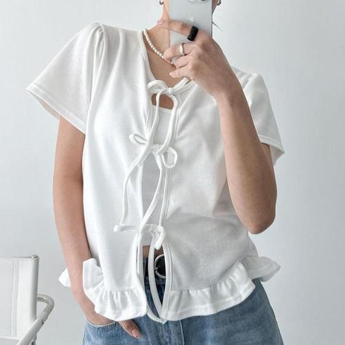 [다잇템]여자 잔주름 리본 면원단 프릴 여름반팔 가디건 (32200962A)
