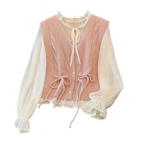 [예쎄](예쎄) [SET]프릴넥 시스루 블라우스+리본 니트조끼 (S4FSE405A)