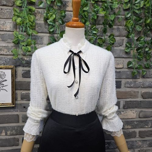 뉴욕멋쟁이 모리나 리본카라 레이스니트 여성블라우스