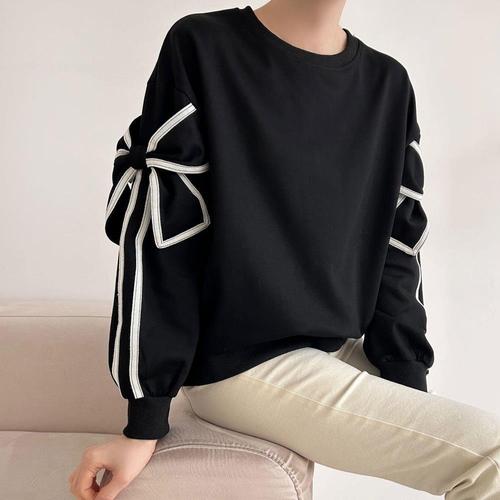 여자 라운드 리본 귀여운 자수 배색줄 맨투맨