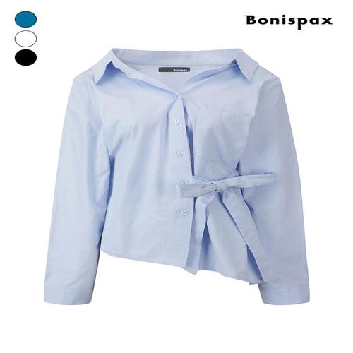[미라클세븐]여성 루즈핏 언발란스 랩 셔츠 가을 출근 스타일 리본 디테일