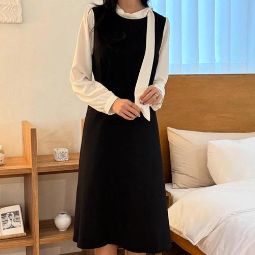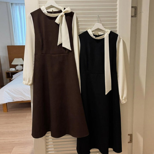 [모노무드]모노무드 해당없음 리본 인기 배색 A라인 여성 감성 1컬러 베이직 롱원피