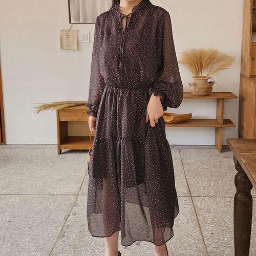 [다잇템]여자 티어드 비침 땡땡이 시폰 리본 롱원피스