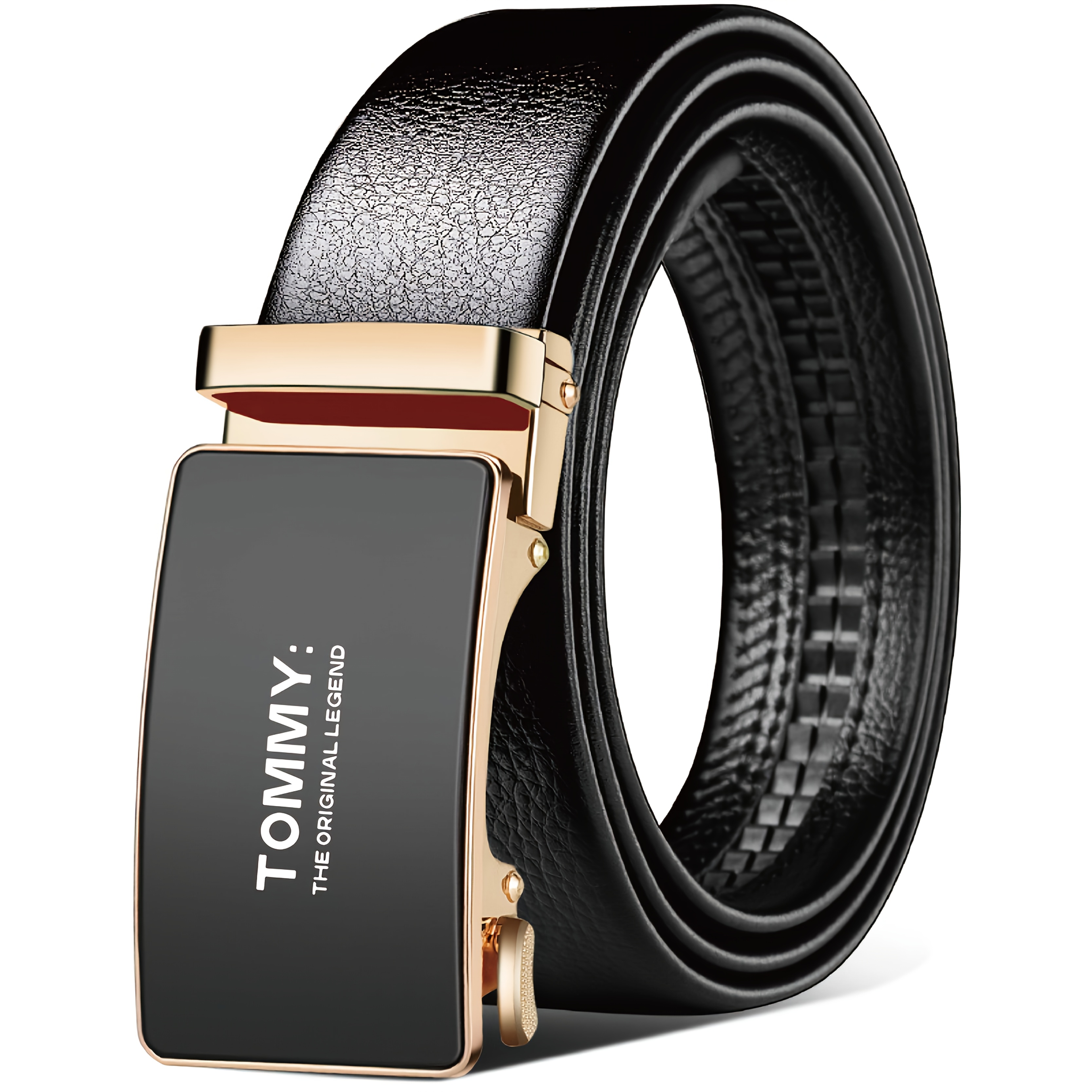 TEMU 톰미 남성용 자동 버클 비즈니스 벨트 - 세련된 블랙 인조 가죽, 내구성 및 착용이 쉬움, 사무실 및 공식 행사용 모던 디자인, 다용도 캐주얼 스타일, 전문적인 의상에 완벽한, 오피스 벨트, 공식 액세서리, 액세서리, 매끄러운 질감, 사무직 종사자용 - 스타일리시하고 고급스러운 착용감, 검정색과 골드 하드웨어