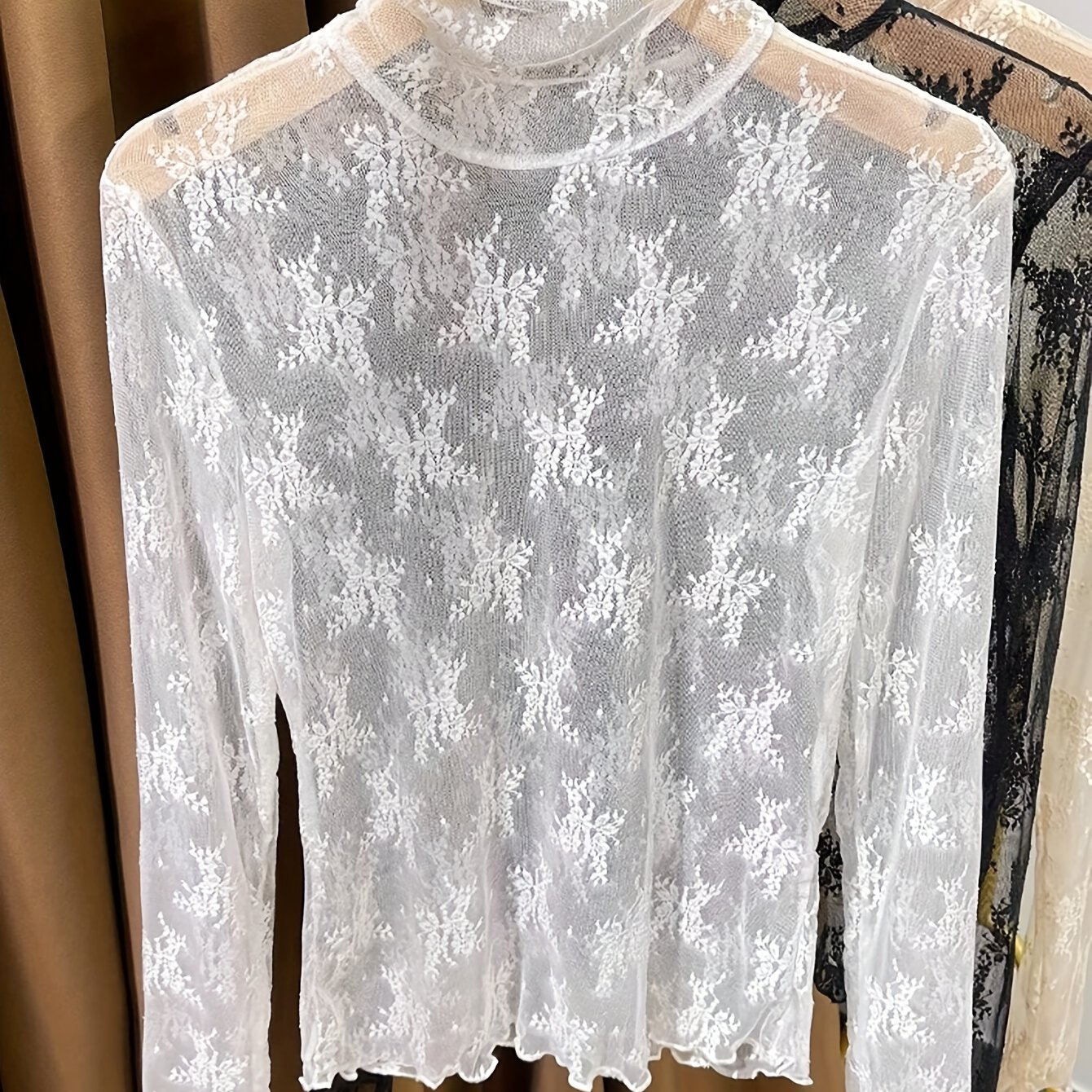 TEMU 여성 레이스 하이넥 긴팔 베이스 레이어 탑, 우아하고 섬세함.