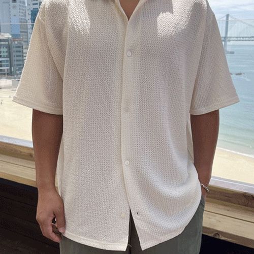 머시따 / 오버핏스마트 펀칭 디테일 린넨 오픈카라 반팔 셔츠