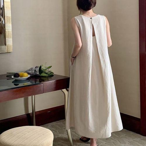 [에이치플러스몰]심플 뒷트임 세련 고급스러운 린넨 하객룩 롱 원피스