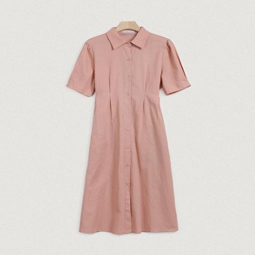 [옷자락]여자 면 린넨 허리단추 반팔 핀턱 카라넥 롱 원피스