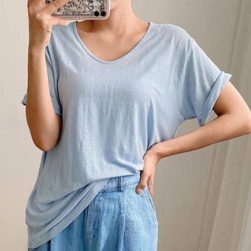 여자 린넨 무지컬러 루즈핏 브이넥 반팔 티셔츠