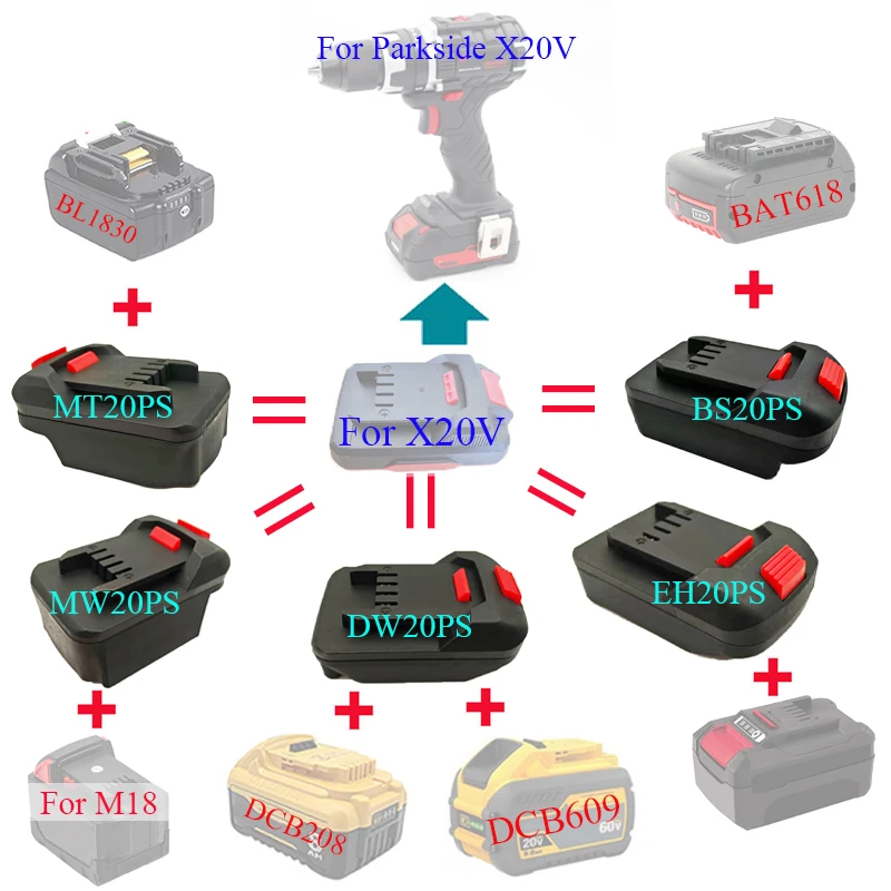 마키타, 디월트, 밀워키(M18), 보쉬, 에인헬, 파크사이드 X20V용 전동공구 부품, 리튬이온 배터리 컨버터