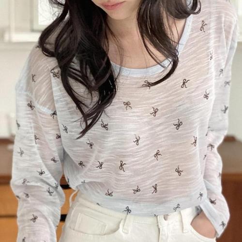 [다잇템]여자 리본패턴 비침 마원단 SS 롱슬리브 니트 (15193121A)
