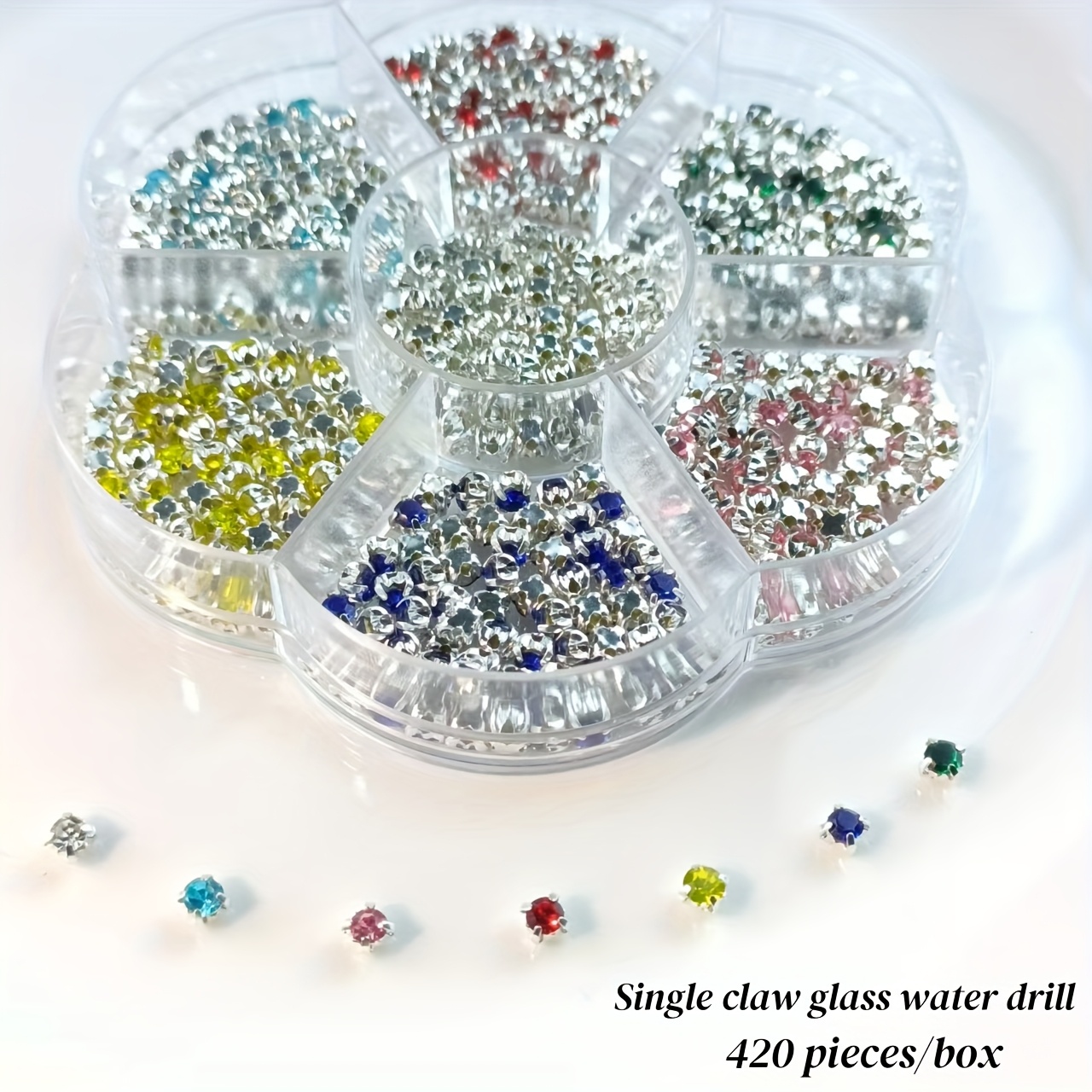 TEMU 색상 블록 박스 420개 세트 - 작은 입자 3mm 컬러 유리 손바느질 단일 클로 라인 석 장식 시퀸, 의류 가방 디자인 액세서리, 모자, 신발, 가방에 봉제 가능, 반짝이는 장식