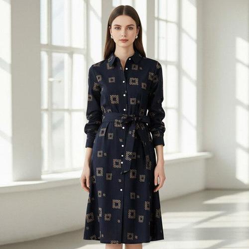TEMU [프린트 원피스 - 데님 원단 아님] 시크하고 편안하며 사려 깊은 여성 데님 스타일 프린트 원피스 - 크루넥, 긴소매, 테일러드, 바디콘, 간편한 디자인, 출퇴근에 이상적
