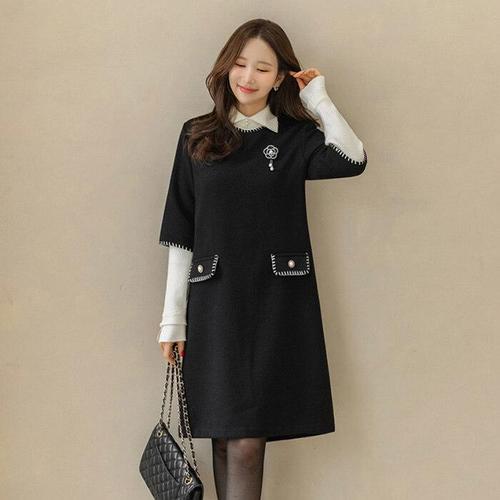 [스타일온미][스타일온미] 마이아 울 블렌딩 버튼홀 스티치 7부 소매 세미 A라인 미디 원피스