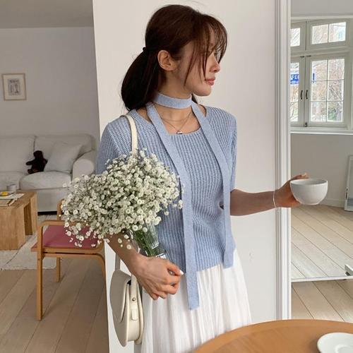 [다잇템]여자 망사 반소매 타이스트랩 귀여운 와플 니트 (32064153A)