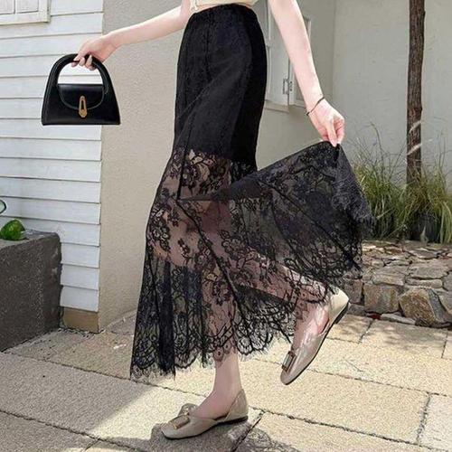 여성 꽃무늬 일자 패턴 비침 망사 롱 스커트