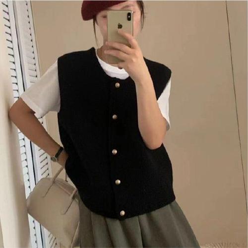 TEMU 1pc 여성용 빈티지 스타일 솔리드 컬러 니트 조끼, 반팔, 버튼 디테일, 캐주얼 라운드넥 스웨터 봄/가을용|반팔